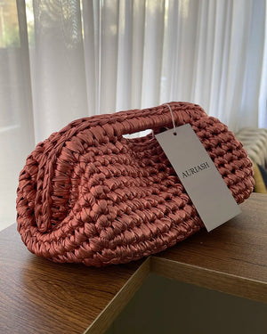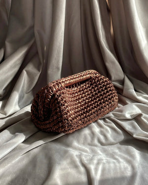 Expertly handcrafted, the clutch features a rich, textured crochet design enhanced by its subtle sheen, creating a play of light that shifts beautifully with every movement. The structured form and integrated handle offer both elegance and ease, making it the perfect companion for evening occasions and elevated styling.